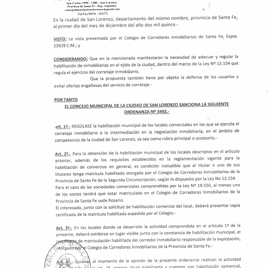 Ordenanza Nº 3492 - San Lorenzo