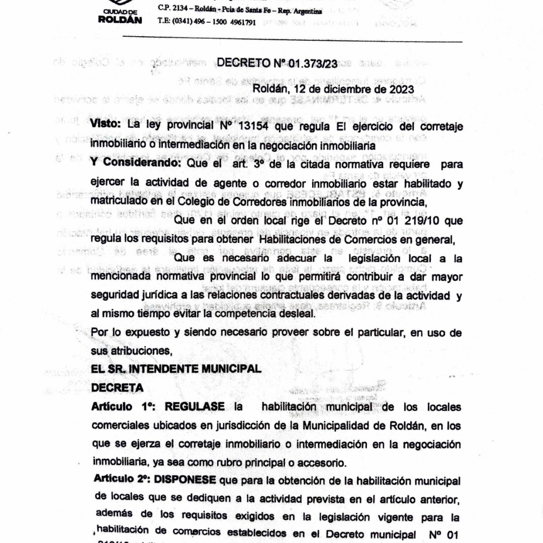 Decreto Nº 01. 373/23 - Roldan